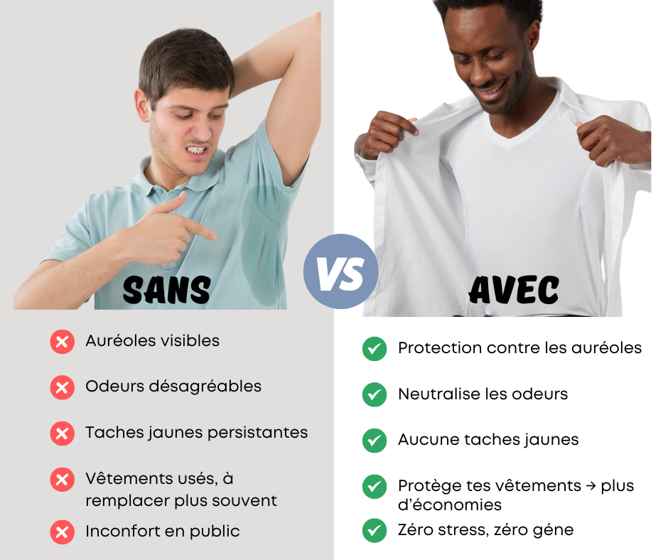 Contrairement aux t-shirts classiques, ils évitent les auréoles, les taches jaunes sous les bras et prolongent la durée de vie de vos hauts.
